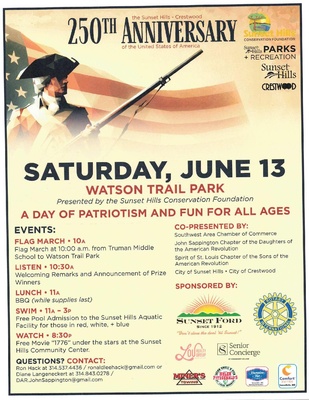 Event Description:ON BEHALF OF THE FOUNDATION FOR SUNSET HILLS, YOU ARE CORDIALLY INVITED TO JOIN US FOR A CELEBRATION OF THE 250TH ANNIVERSARY OF THE UNITED STATES OF AMERICA ON JUNE 13,2026 AT WATSON TRAILS PARK IN SUNSET HILLS.Location:WATSON TRAIL PARK