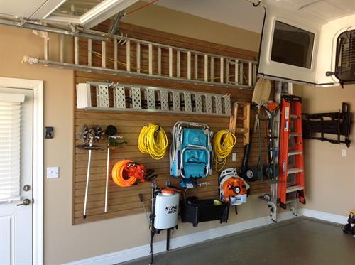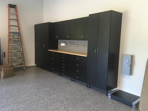 We also build complete garage organization systems with custom cabinets, slatwall, and overhead storage racks, plus full garage remodels that combine flooring, storage, and finishing details into one cohesive design.